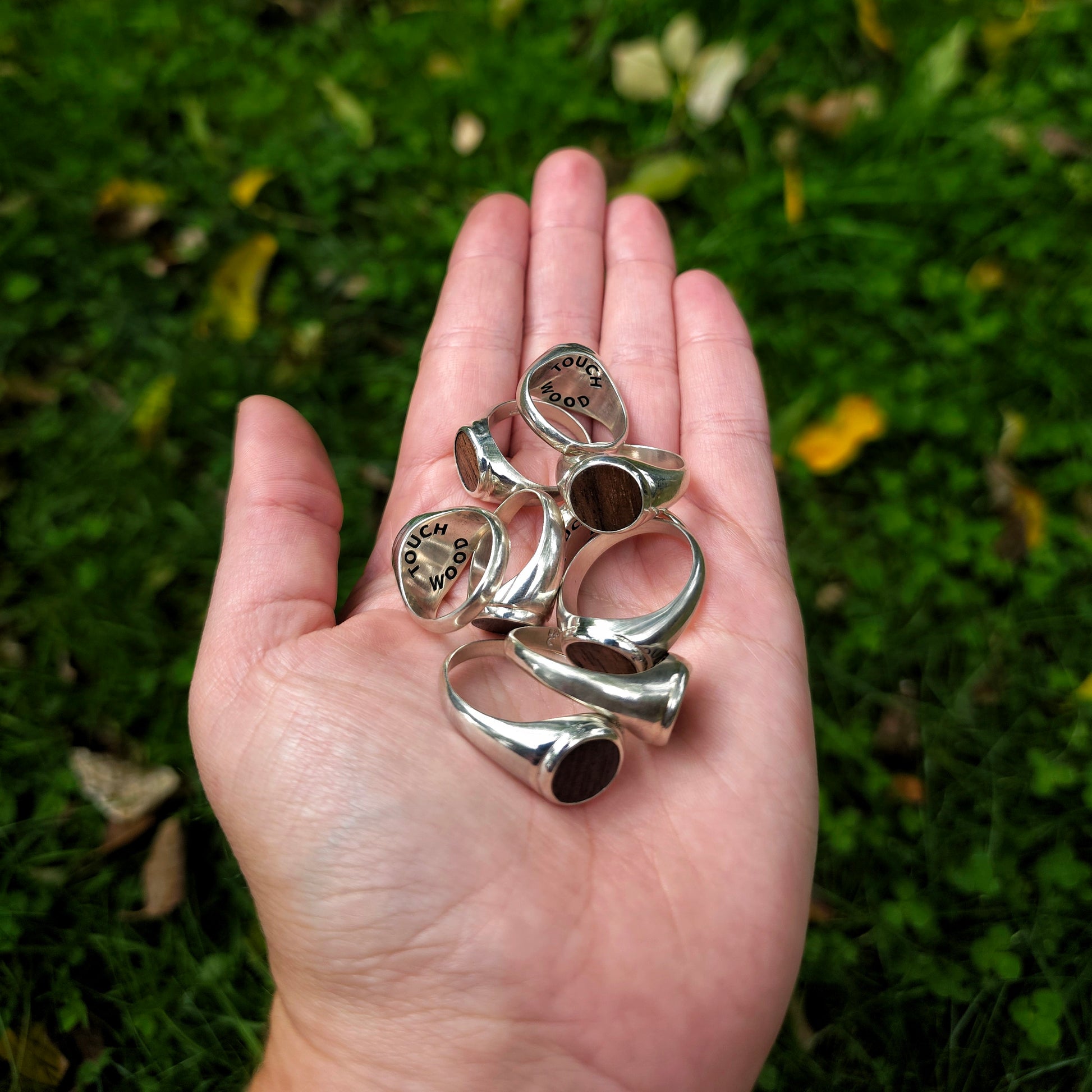 Size V handmade ‘touch wood’ signet ring. Crafted from silver and wood. Each piece is unique and one of a kind with wood being like a fingerprint, no two are the same. The saying touch wood comes from the belief that when touched the trees spirit will ward off evil or grant you a wish, wear this touch wood ring so you always have a piece of wood with you to touch.