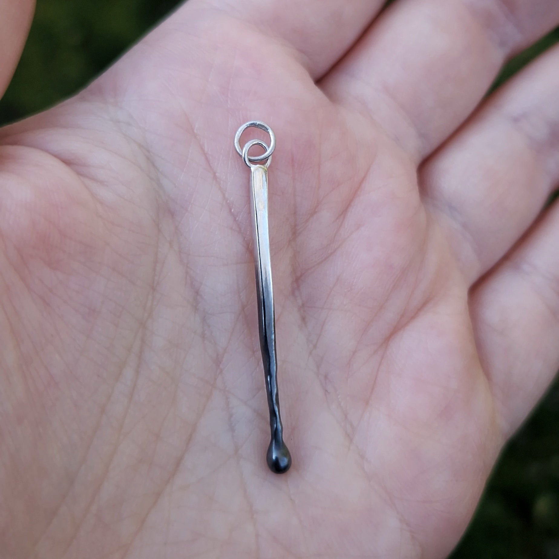 Burnt matchstick charm. Capturing the rustic charm of a spent match, this piece is a tribute to the smoky scent that lingers after lighting a candle. The spark that ignites countless meaningful moments. Handcrafted using the ancient art of lost wax casting, this piece begins as a meticulously hand-carved wax model before being transformed into solid silver.